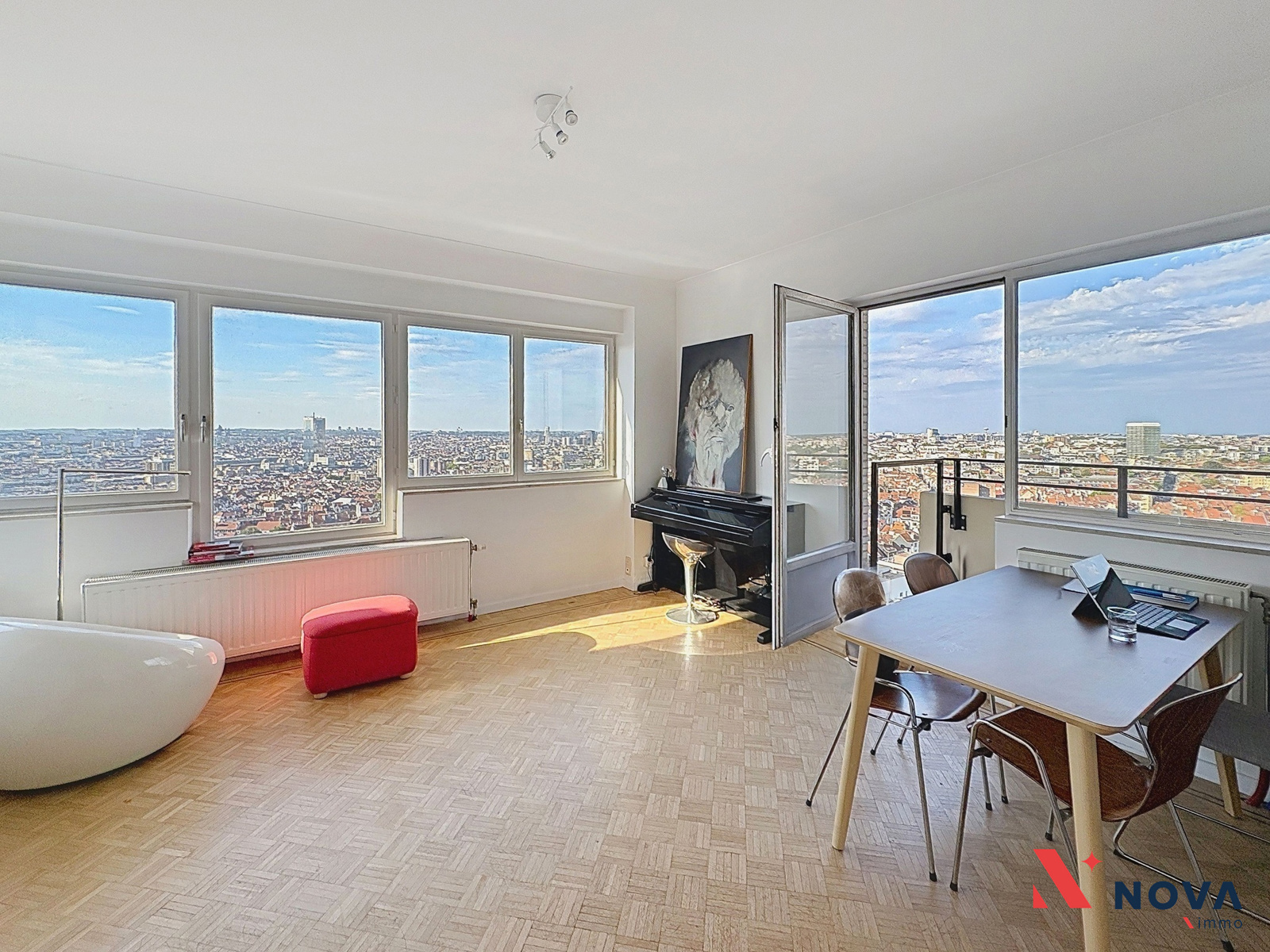 Situé à deux pas du Parc de Forest, dans la célèbre Tour Albert, conçue par l’architecte Jacques Cuisinier, cet appartement d’exception occupe le 17ᵉ étage d’un immeuble emblématique de Bruxelles. Sa vue panoramique à couper le souffle embrasse toute la capitale, avec en ligne d’horizon les monuments les plus iconiques tels que le Palais de Justice, la Basilique de Koekelberg, la Tour du Midi et l’Atomium.