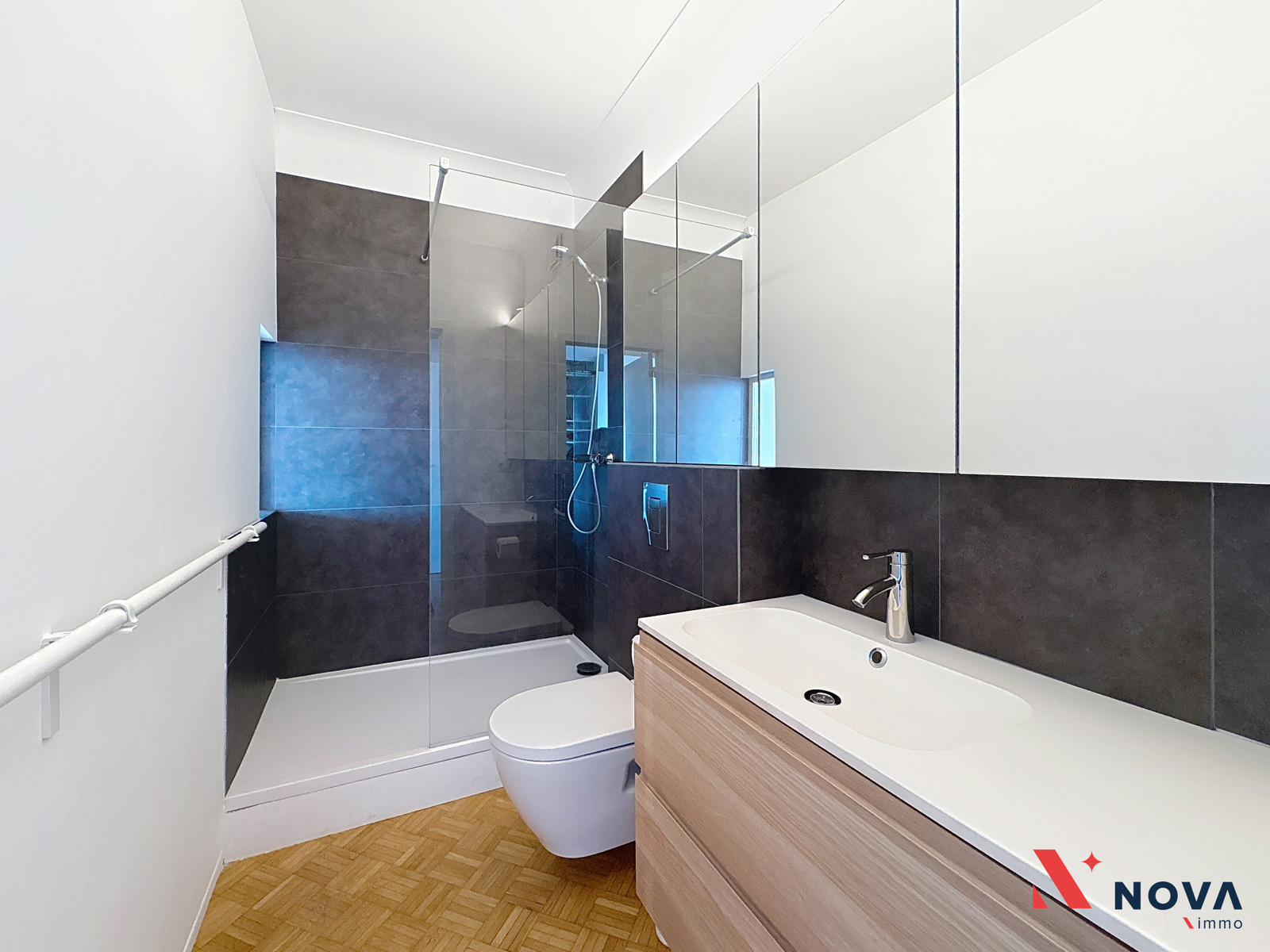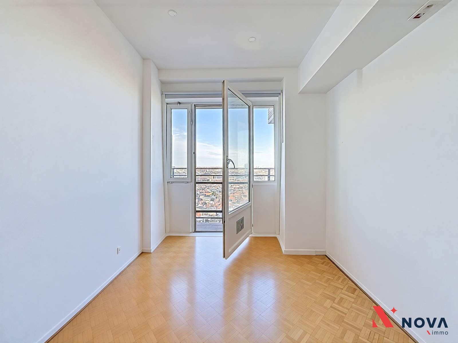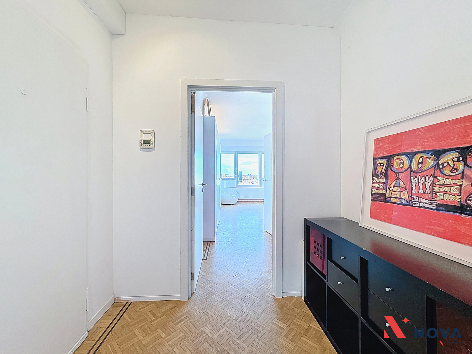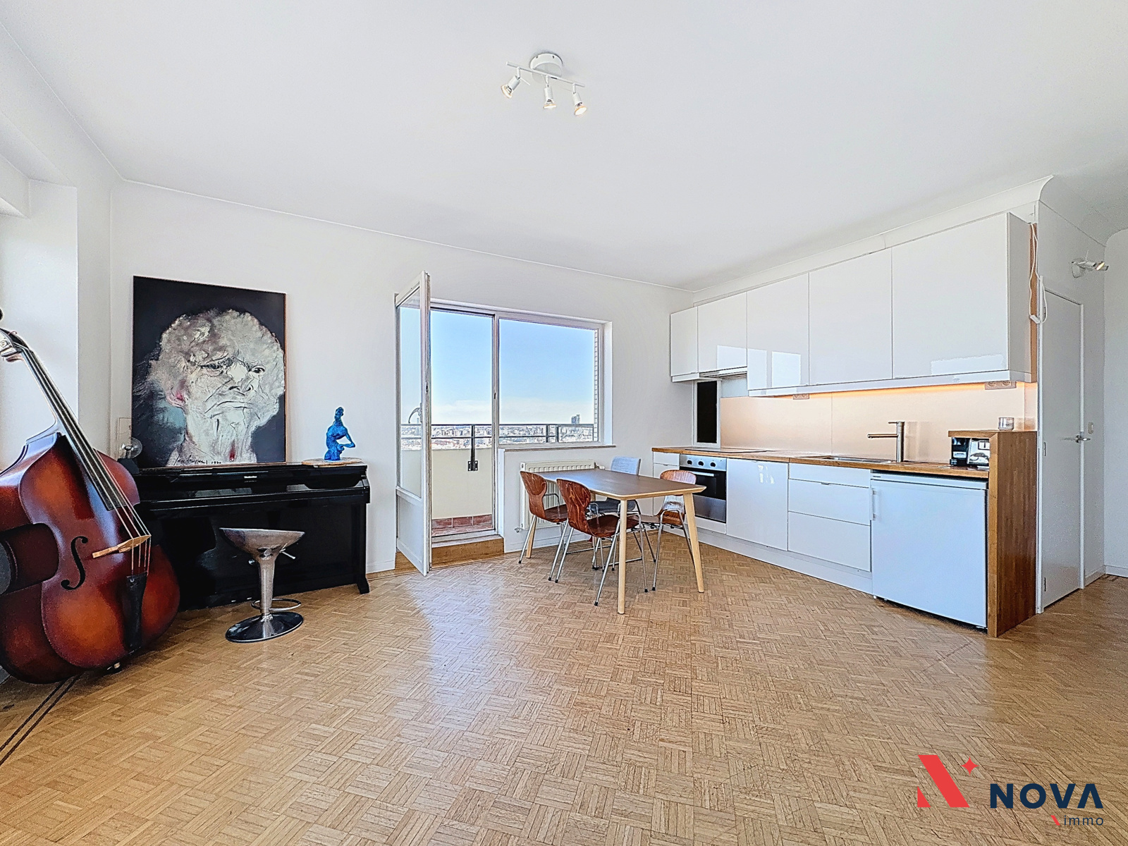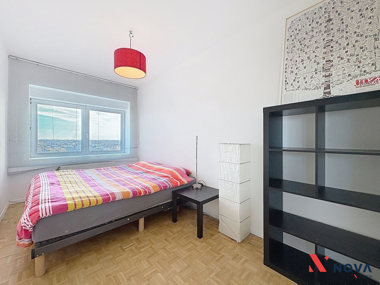 Développant une superficie de ±88 m² (selon PEB), l’appartement se compose d’un hall d’entrée menant vers un vaste séjour en L de ±35 m², baigné de lumière, avec sa cuisine moderne entièrement équipée et deux balcons offrant une vue imprenable sur le skyline bruxellois. Un mur léger sépare actuellement un espace bureau/salon, pouvant être facilement ouvert pour agrandir le séjour. L’espace nuit dessert deux chambres (±12 m² et ±14 m²), dont la seconde bénéficie d’un accès à un troisième balcon et d’une cuisine indépendante semi-équipée. L’appartement comprend également une salle de douche rénovée, avec douche italienne et une seconde salle de bain avec baignoire. Un WC séparé complète l’ensemble.
