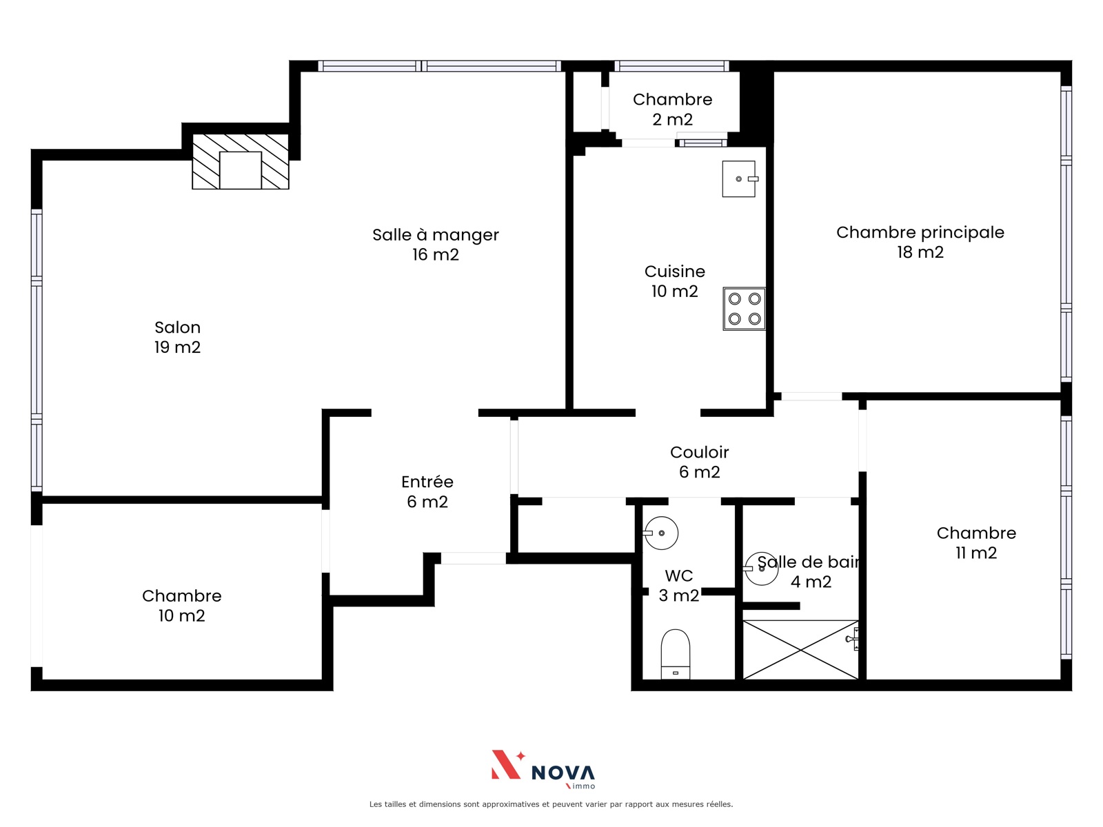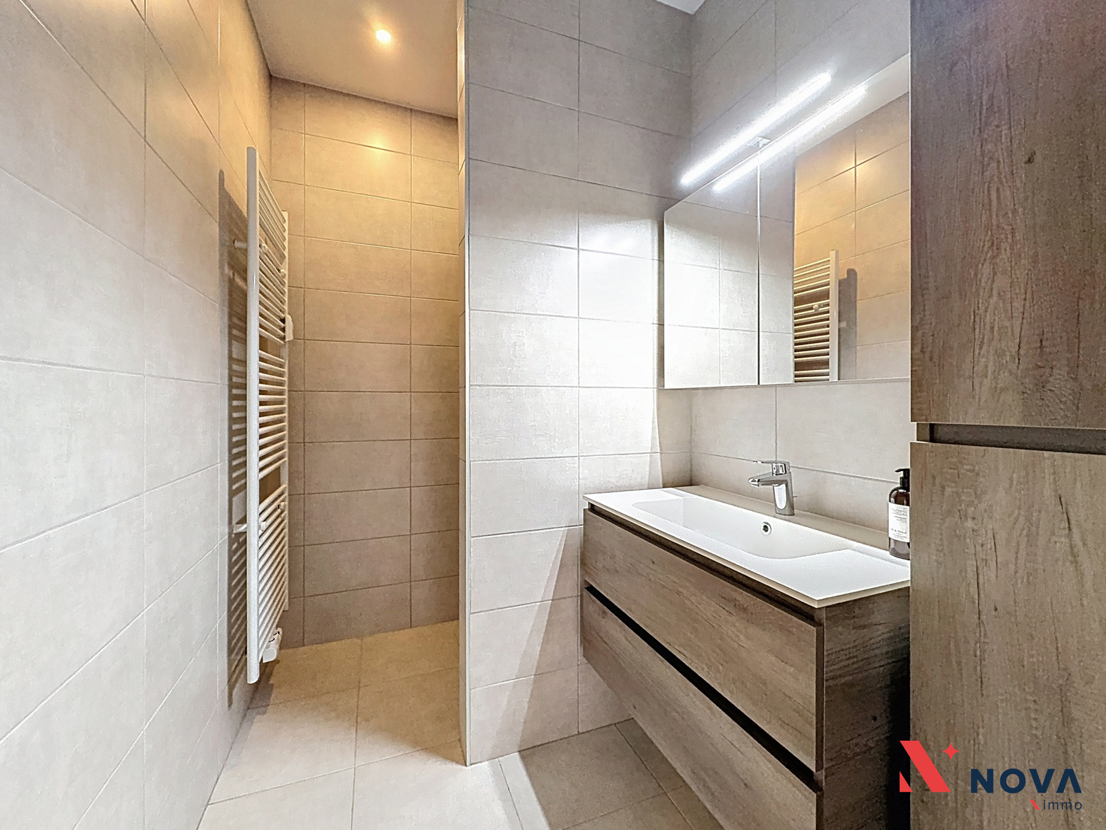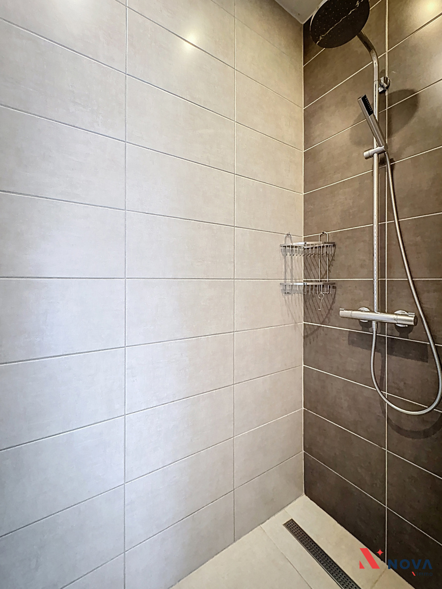L’espace nuit comprend trois chambres de ±18 m², ±11 m² et ±10 m². Une salle de douche entièrement rénovée ainsi qu’un WC séparé complètent l’agencement, accessibles via le hall de nuit.