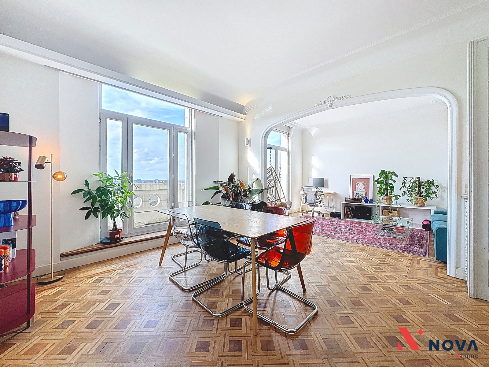 Situé dans le haut de Saint-Gilles, au sein d’un immeuble de style Beaux-Arts érigé en 1925 et inscrit à l’inventaire du patrimoine architectural bruxellois, cet appartement de ±120 m² prend place au 7ᵉ et dernier étage et bénéficie d’une vue panoramique sur Bruxelles.