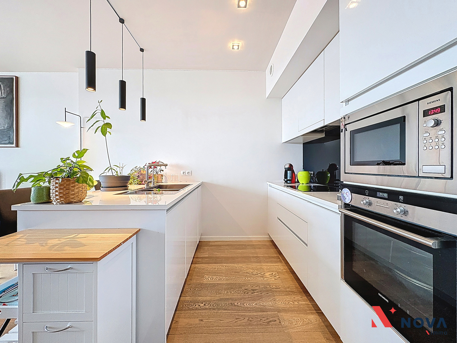 L’entrée dispose d’un hall avec vestiaire sur mesure et WC séparé, menant vers un séjour lumineux de ±37 m² avec parquet semi-massif et cuisine américaine entièrement équipée avec îlot central. L’espace de vie donne accès à une terrasse de ±12 m² permettant de profiter pleinement de la vue dégagée. Le hall de nuit dessert deux chambres de ±12 m² et ±16 m², cette dernière avec armoires intégrées sur mesure. Les deux chambres ont un accès direct à la terrasse, apportant une continuité entre intérieur et extérieur. Une salle de bain de ±8 m² avec double vasque, baignoire, douche et WC complète l’espace nuit. Une buanderie indépendante vient parfaire la distribution.