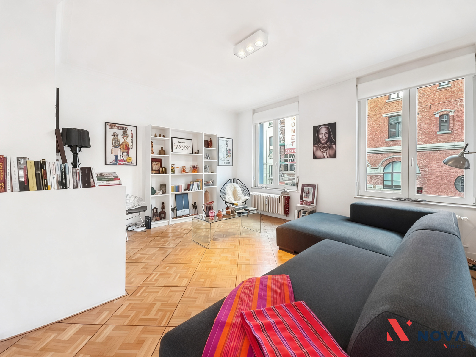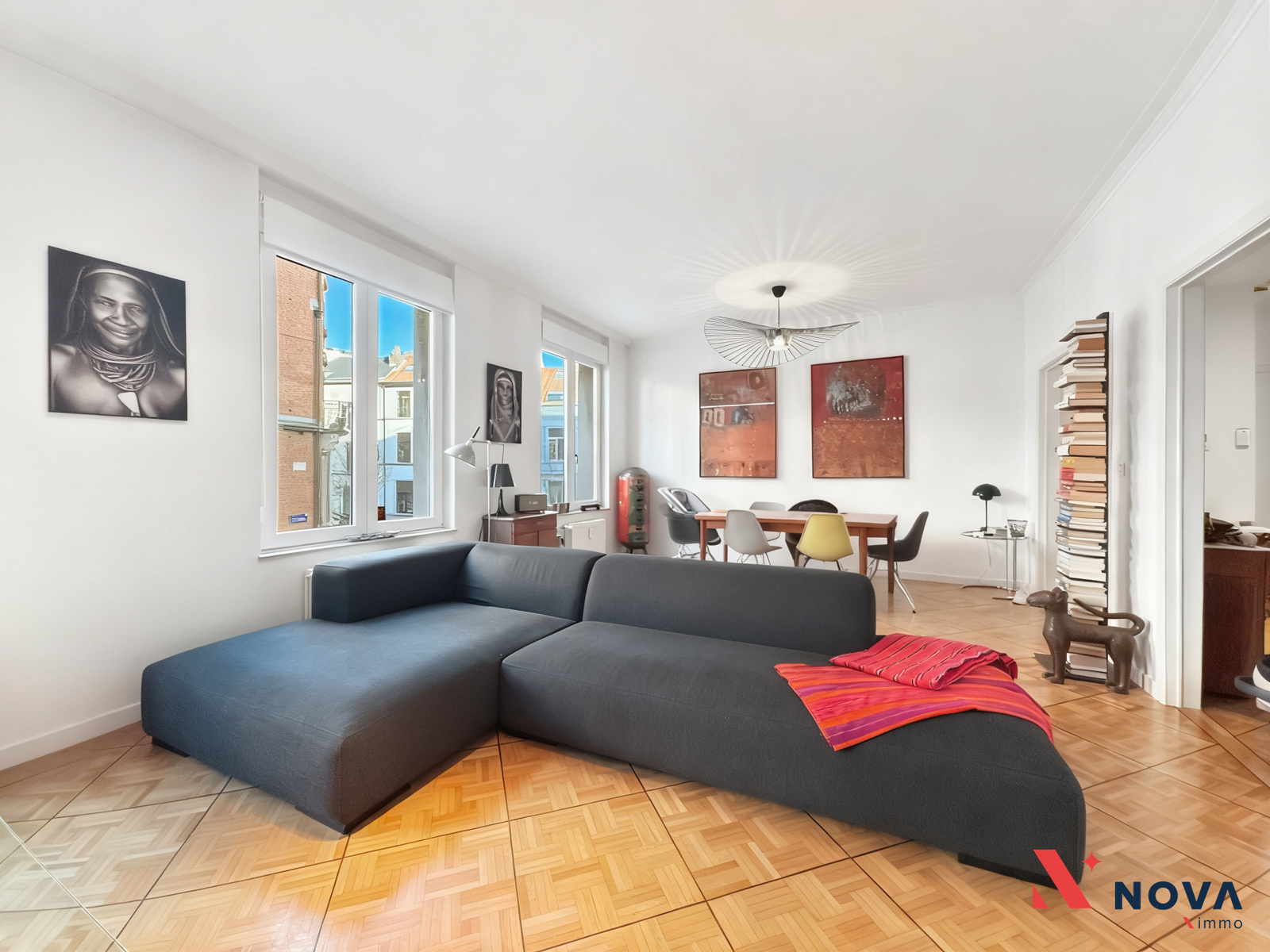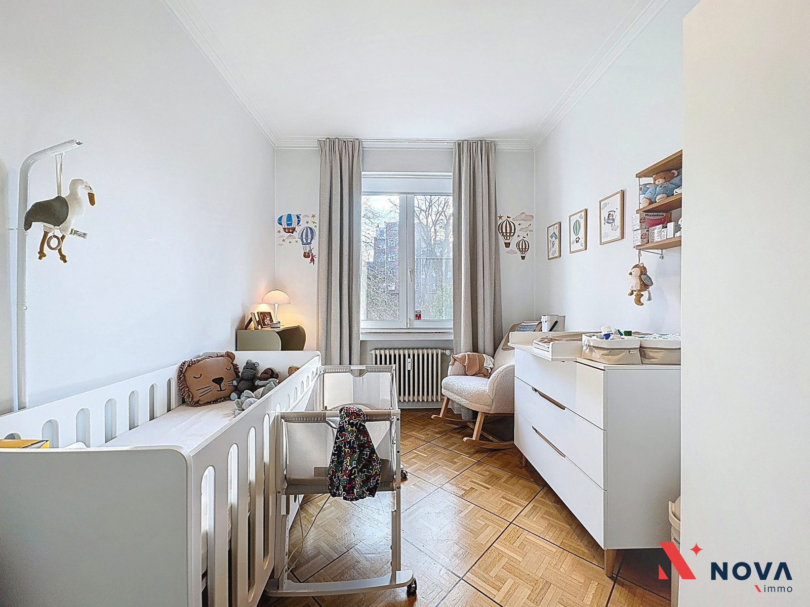 L’appartement s’ouvre sur un hall d’entrée desservant un agréable séjour de ±31 m², baigné de lumière et sublimé par un beau parquet en mosaïque, offrant de beaux volumes et une atmosphère chaleureuse. La cuisine séparée, entièrement équipée et d’une superficie de ±12 m², donne accès à un balcon orienté sud de ±4 m². Le hall de nuit distribue deux chambres de ±15 & ±16 m², un WC séparé ainsi qu’une salle de bain de ±6 m² avec baignoire et arrivées d’eau pour machine à laver.