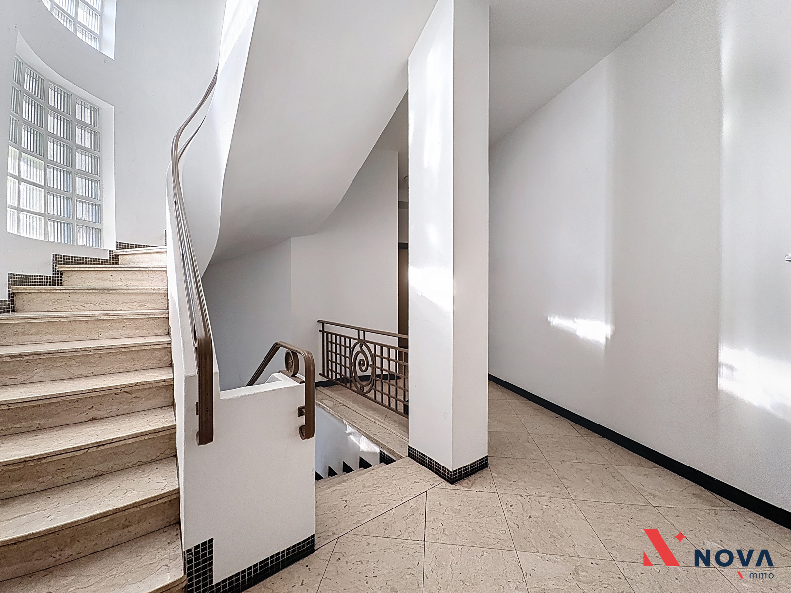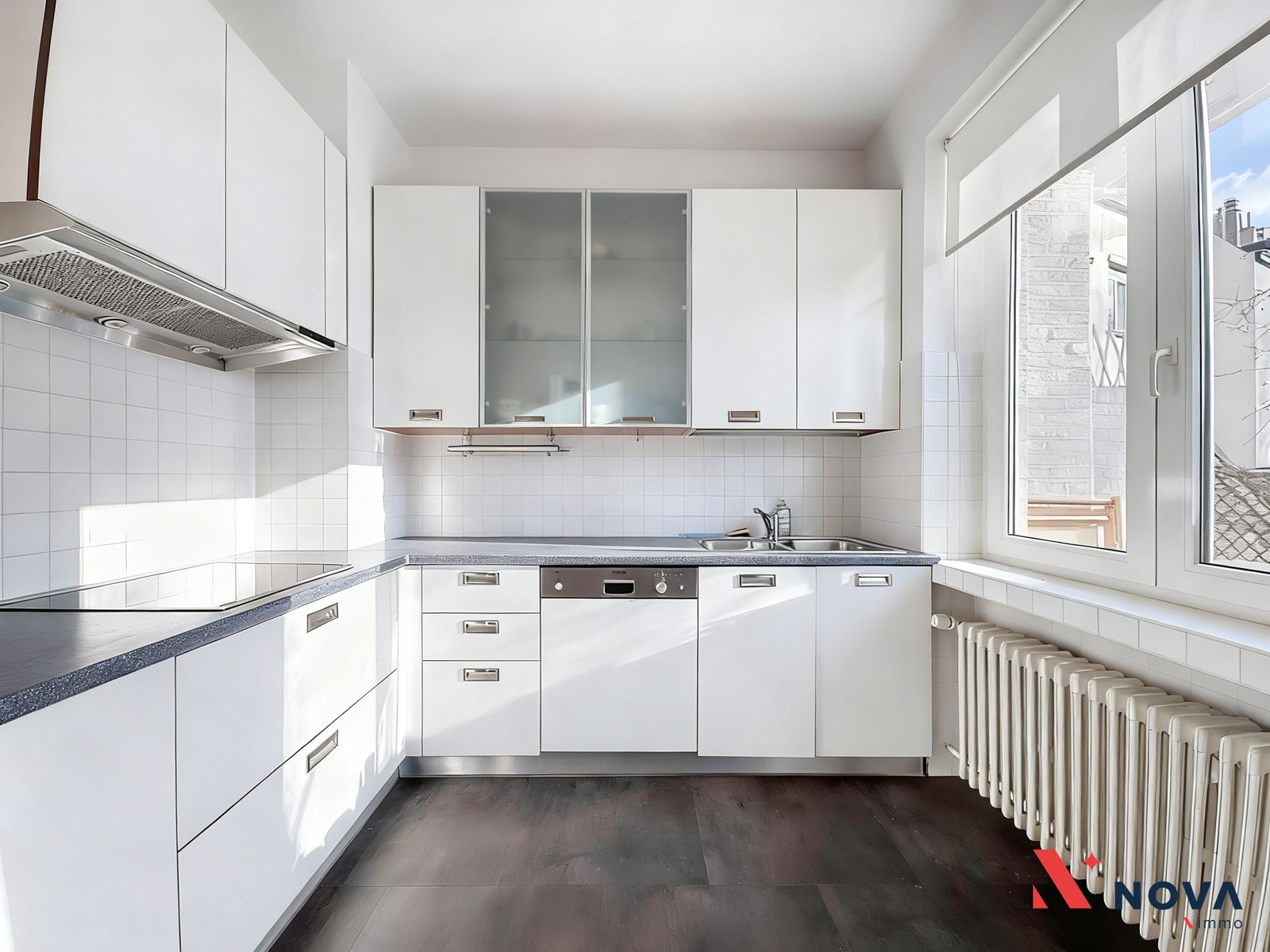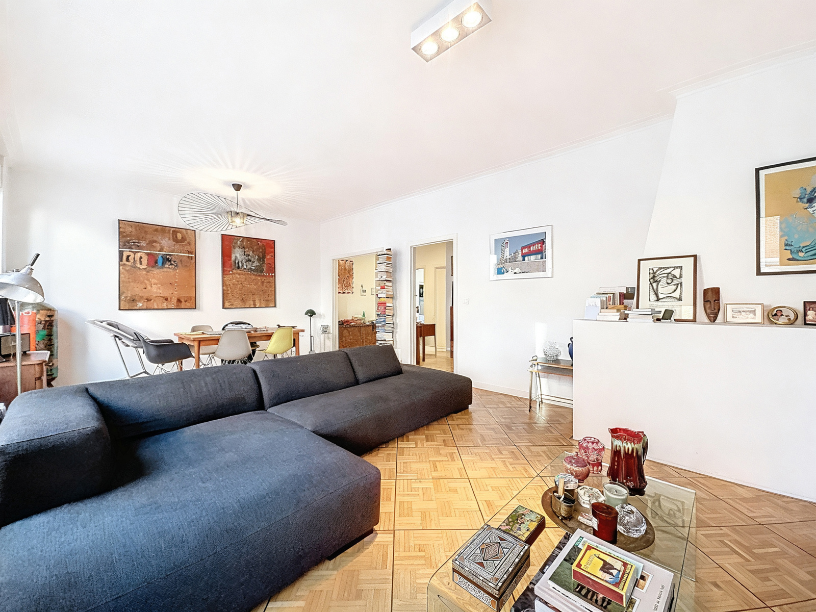 L’appartement s’ouvre sur un hall d’entrée desservant un agréable séjour de ±31 m², baigné de lumière et sublimé par un beau parquet en mosaïque, offrant de beaux volumes et une atmosphère chaleureuse. La cuisine séparée, entièrement équipée et d’une superficie de ±12 m², donne accès à un balcon orienté sud de ±4 m². Le hall de nuit distribue deux chambres de ±15 & ±16 m², un WC séparé ainsi qu’une salle de bain de ±6 m² avec baignoire et arrivées d’eau pour machine à laver.