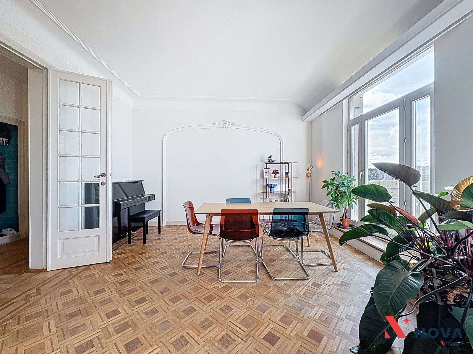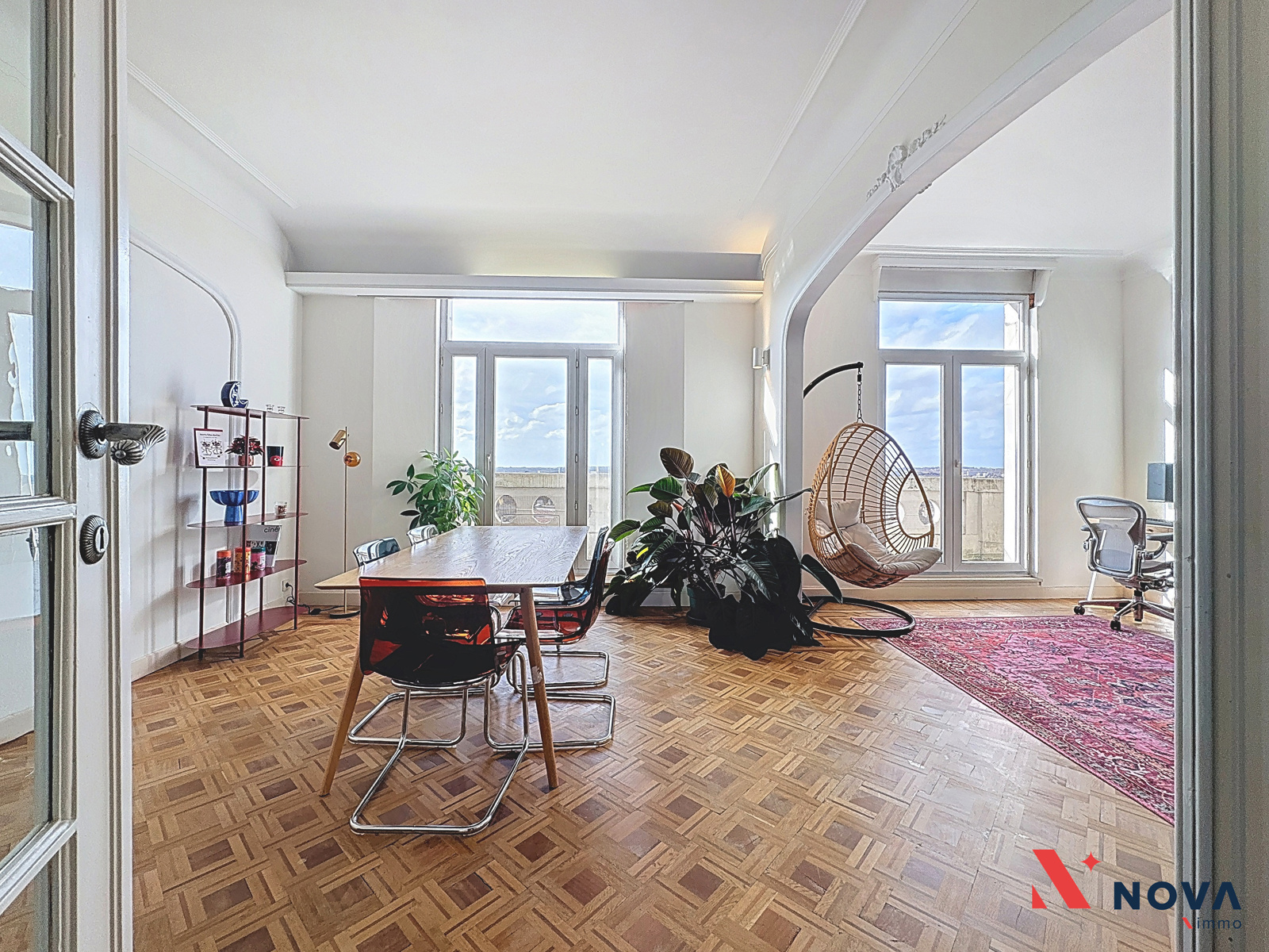 Dès l’entrée, un hall spacieux mène vers un séjour d’environ 30 m², sublimé par ses hauts plafonds, ses élégantes moulures et son parquet en mosaïque, apportant énormément de caractère à la pièce de vie. Cet espace donne accès à un balcon bénéficiant d’une vue dégagée sur Bruxelles. La cuisine séparée, entièrement équipée avec électroménagers Bosch, dispose également d’un espace buanderie. Le hall de nuit dessert deux chambres confortables de ±17 m² et ±15 m². Une salle de bain d’environ 6 m² avec douche italienne et WC complète l’agencement de l’appartement. L’appartement dispose également d’une cave privative ainsi que d’une chambre de bonne de ±8 m², située sous les combles, idéale comme espace de rangement, bureau ou pièce polyvalente.