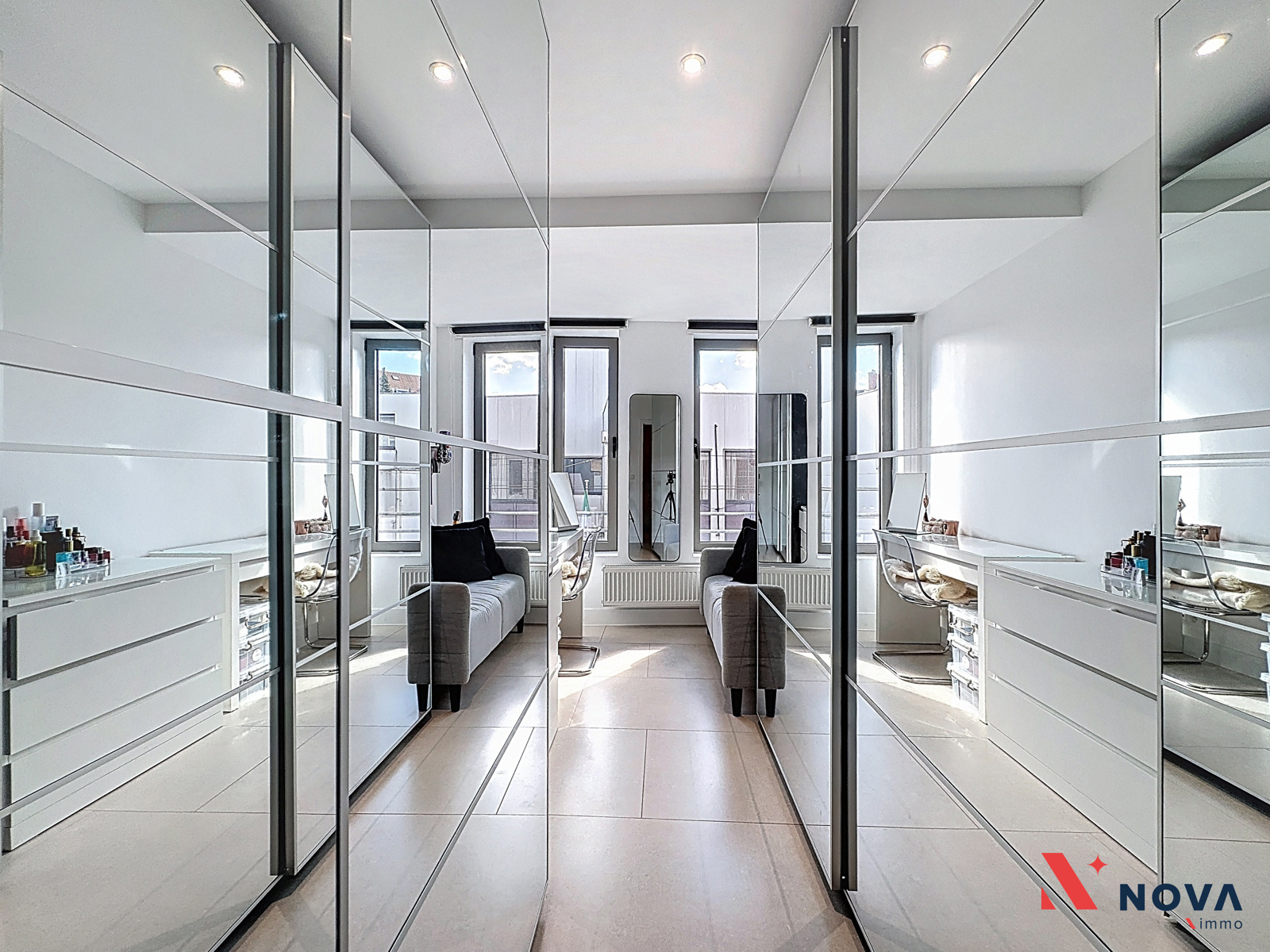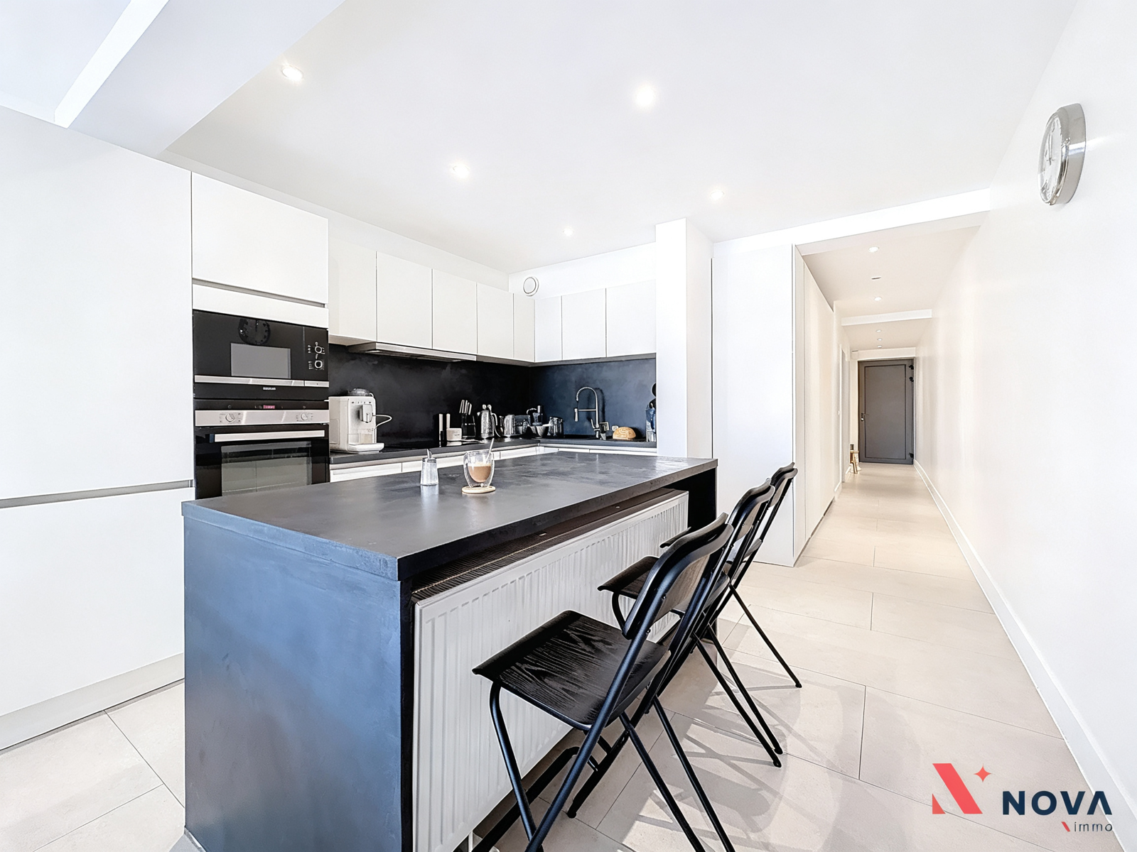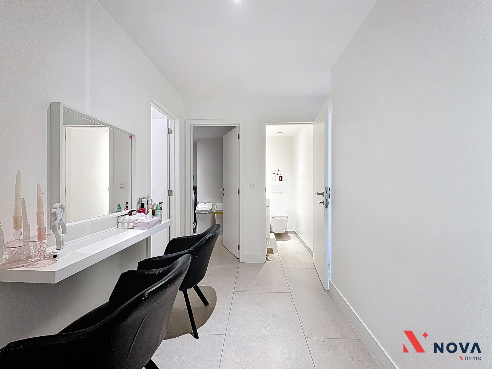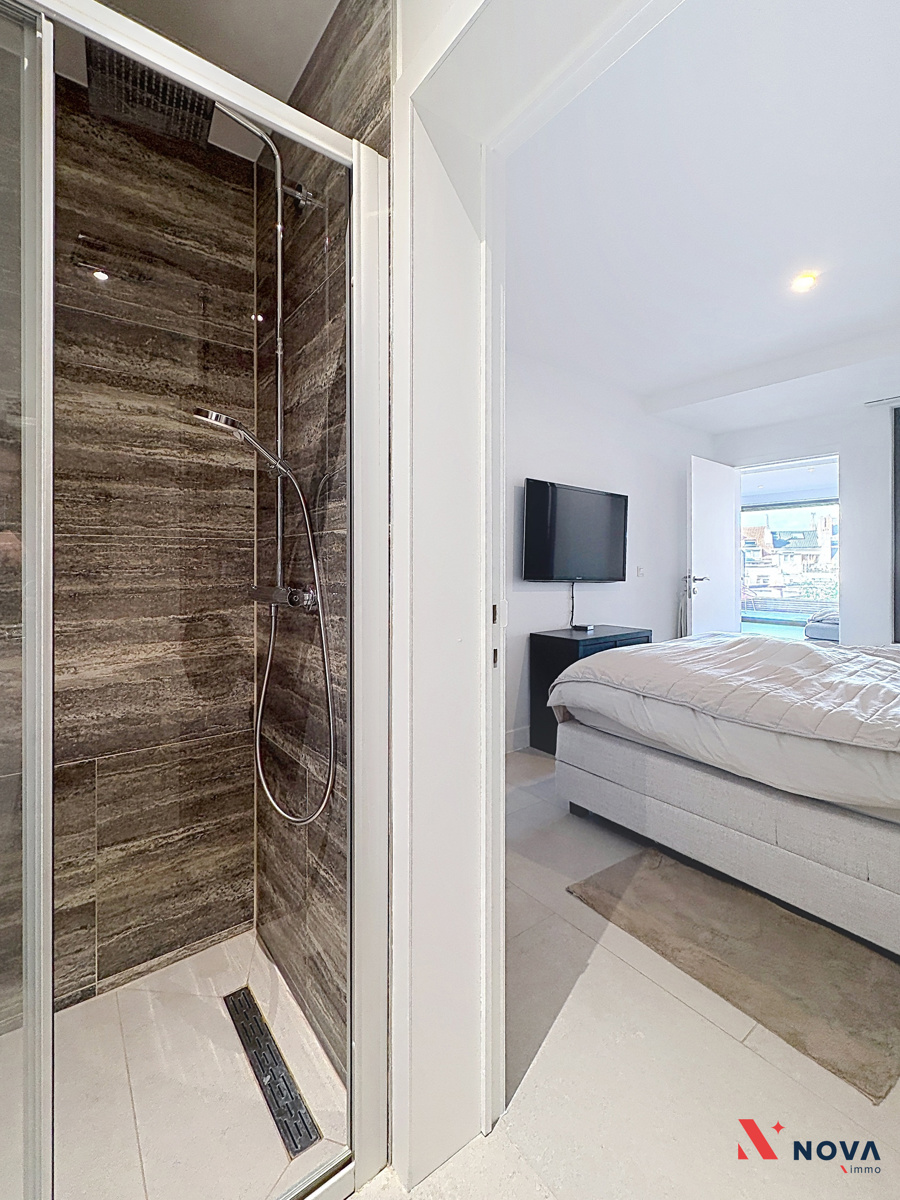 L’appartement s’ouvre sur un hall d’entrée lumineux menant vers un vaste séjour de ±50 m², offrant de superbes volumes et une ambiance moderne. L’espace de vie comprend une cuisine américaine entièrement équipée avec îlot central, ainsi qu’un patio intérieur apportant une belle luminosité. Depuis le séjour, accès direct à une première chambre de ±13 m² avec salle de douche attenante. Dans le prolongement, une spacieuse terrasse de ±30 m² orientée ouest permet de profiter pleinement d’un agréable espace extérieur. Le hall de nuit dessert deux autres chambres de ±13 m² et ±10 m², une salle de bain avec baignoire, double vasque et douche italienne en marbre, ainsi qu’une buanderie indépendante et un WC séparé.