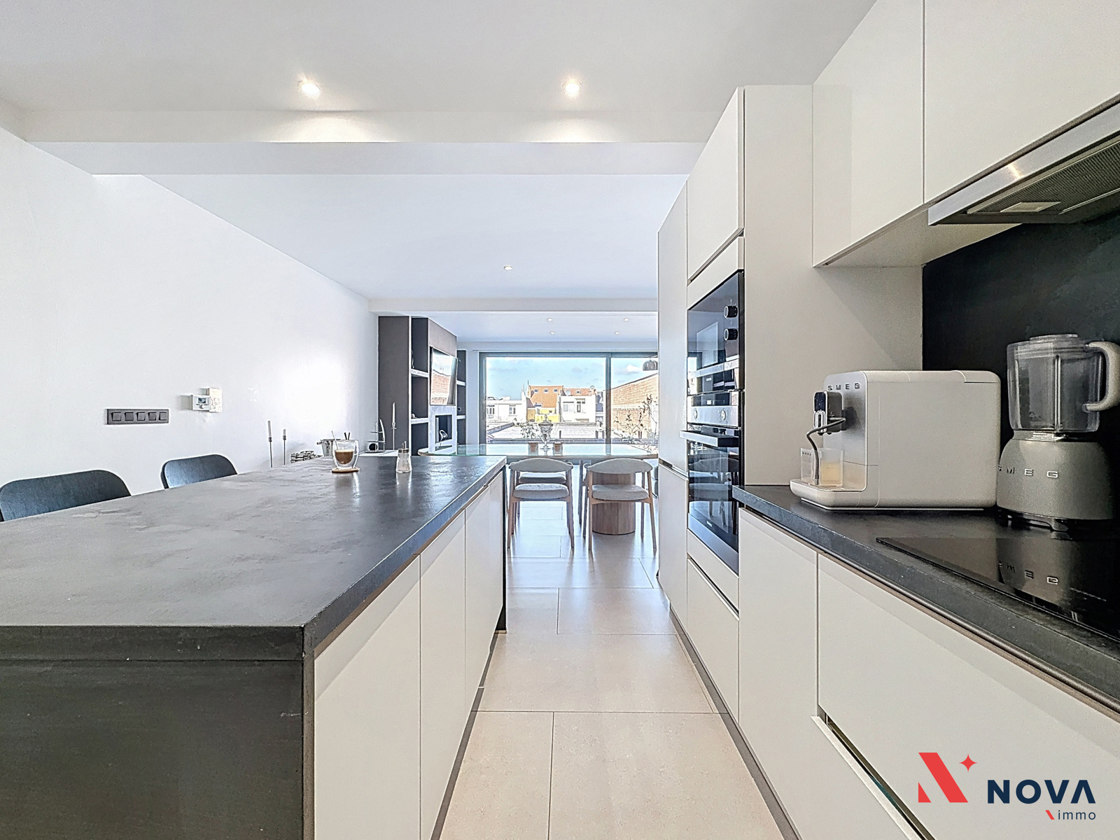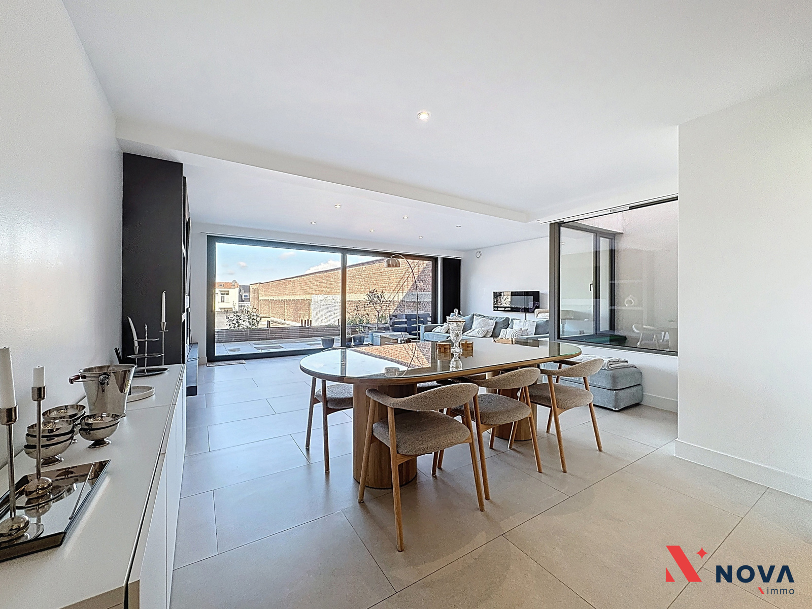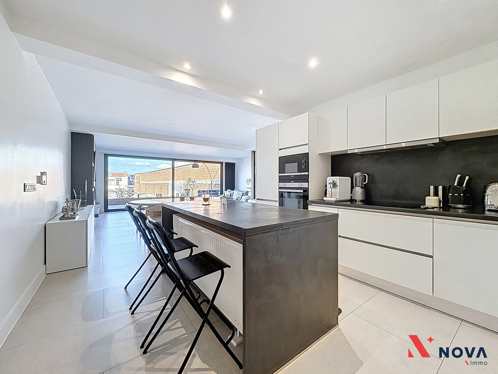 L’appartement s’ouvre sur un hall d’entrée lumineux menant vers un vaste séjour de ±50 m², offrant de superbes volumes et une ambiance moderne. L’espace de vie comprend une cuisine américaine entièrement équipée avec îlot central, ainsi qu’un patio intérieur apportant une belle luminosité. Depuis le séjour, accès direct à une première chambre de ±13 m² avec salle de douche attenante. Dans le prolongement, une spacieuse terrasse de ±30 m² orientée ouest permet de profiter pleinement d’un agréable espace extérieur. Le hall de nuit dessert deux autres chambres de ±13 m² et ±10 m², une salle de bain avec baignoire, double vasque et douche italienne en marbre, ainsi qu’une buanderie indépendante et un WC séparé.