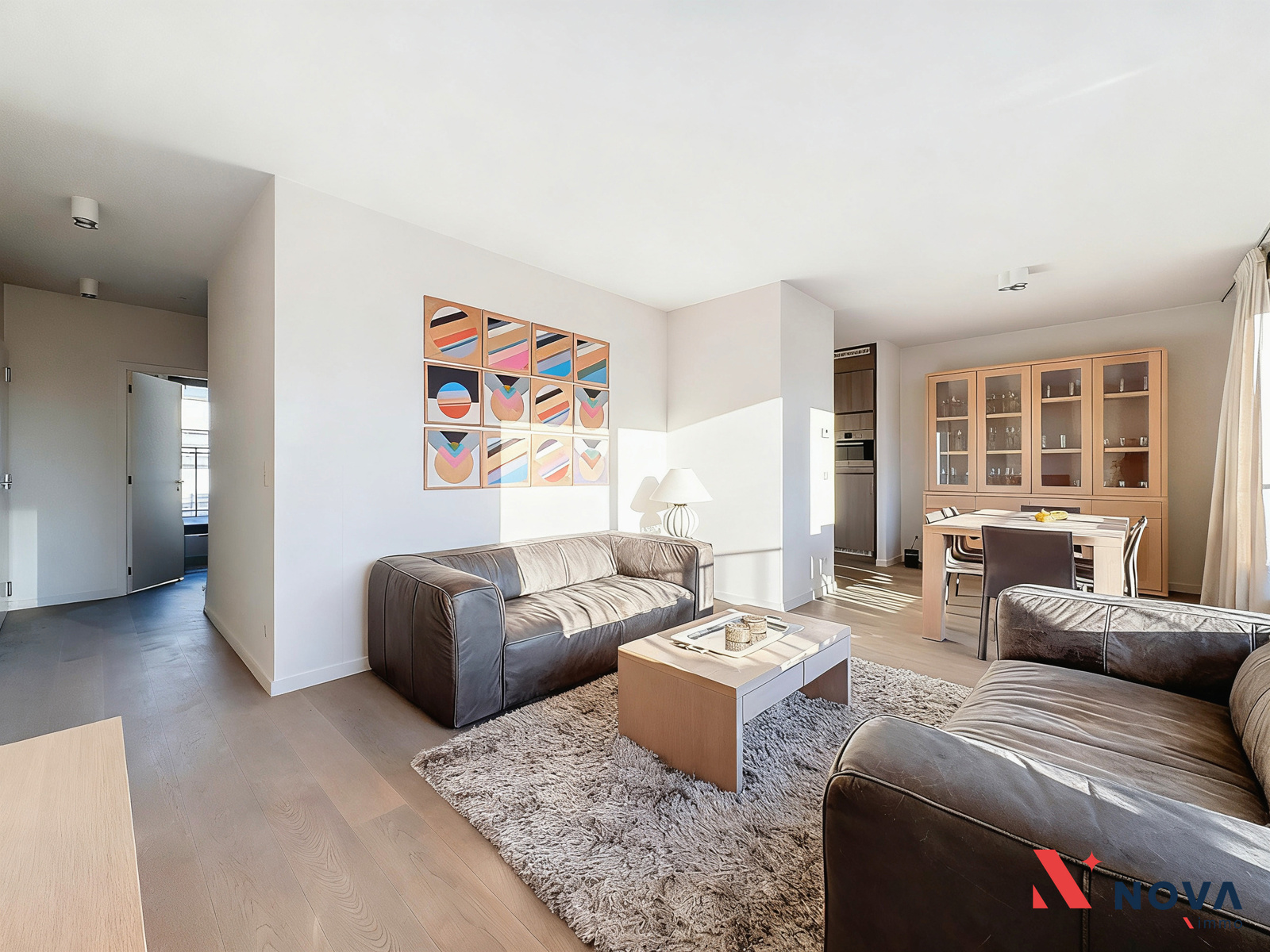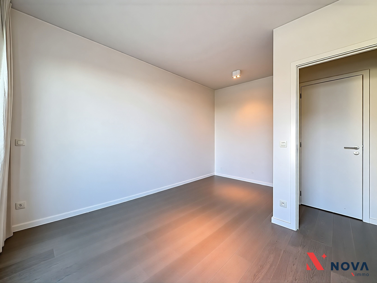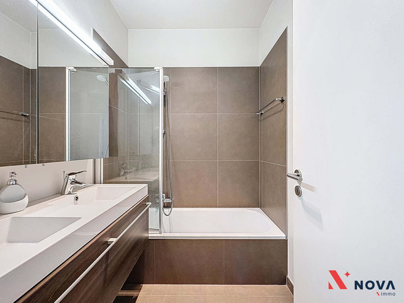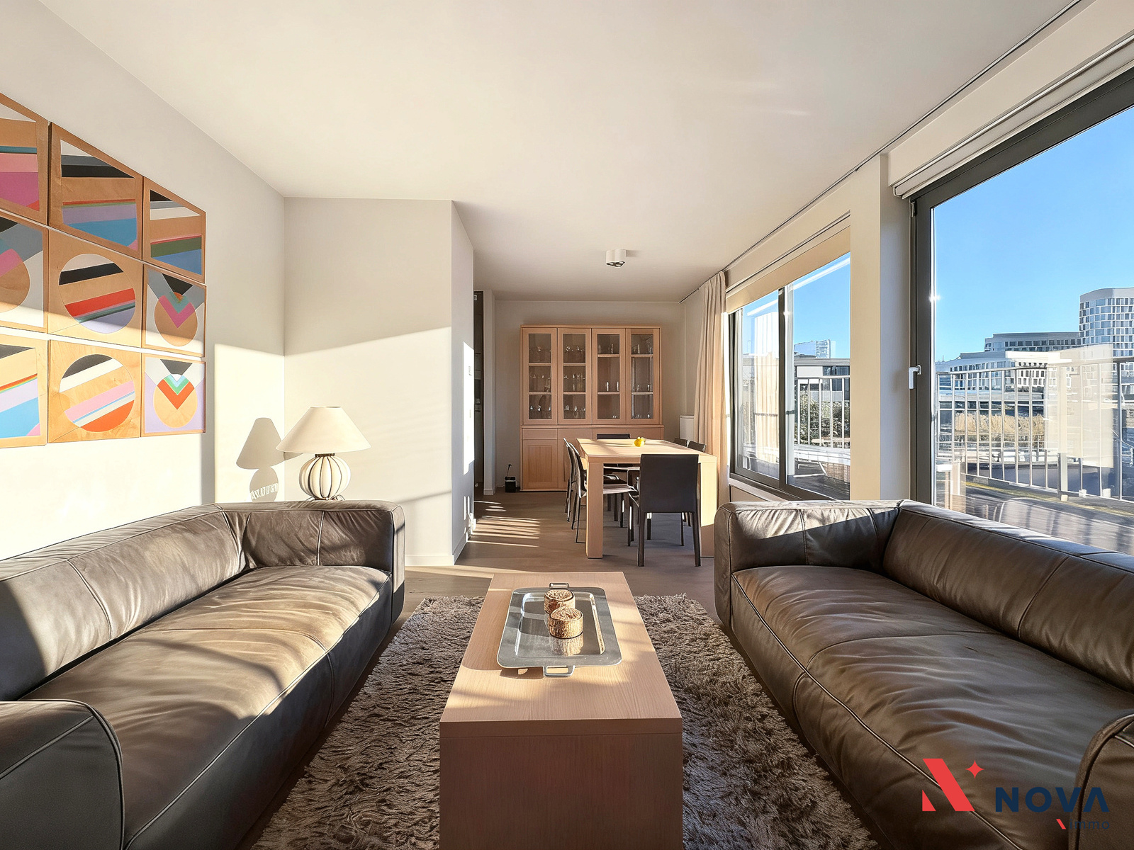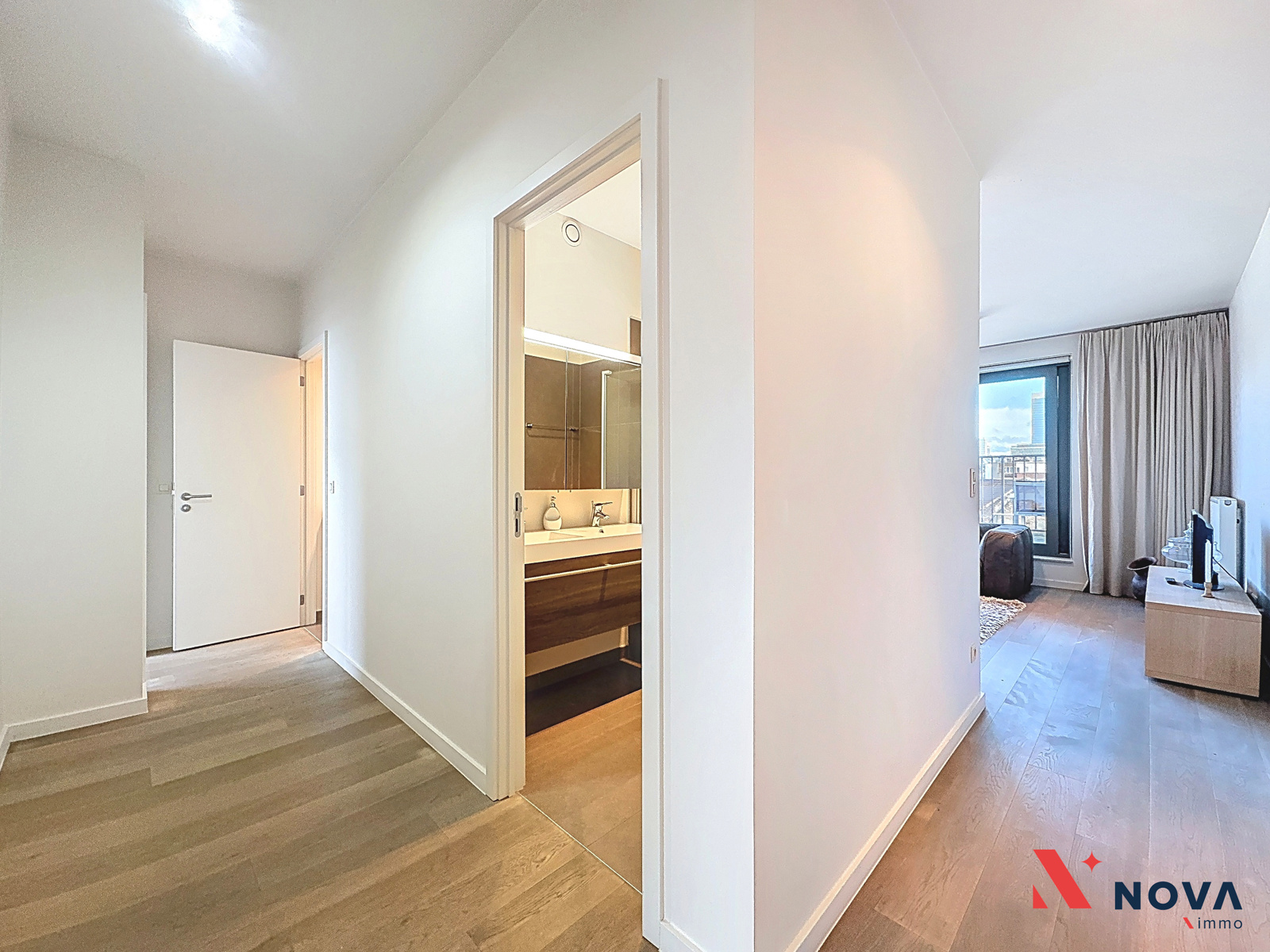 L’appartement développe un élégant espace de vie avec parquet semi-massif et cuisine entièrement équipée. Le séjour donne accès à une première terrasse de ±15 m² orientée est, offrant une vue dégagée sur le skyline emblématique de Bruxelles et ses tours de prestige, dans un environnement particulièrement calme et préservé. Une buanderie indépendante complète l’espace de vie. Le hall de nuit dessert deux chambres de ±10 m² et ±14 m² ainsi qu’une salle de bain avec baignoire et double vasque. Un WC séparé est également présent. Les deux chambres bénéficient d’un accès direct à une seconde terrasse de ±50 m² orientée ouest.